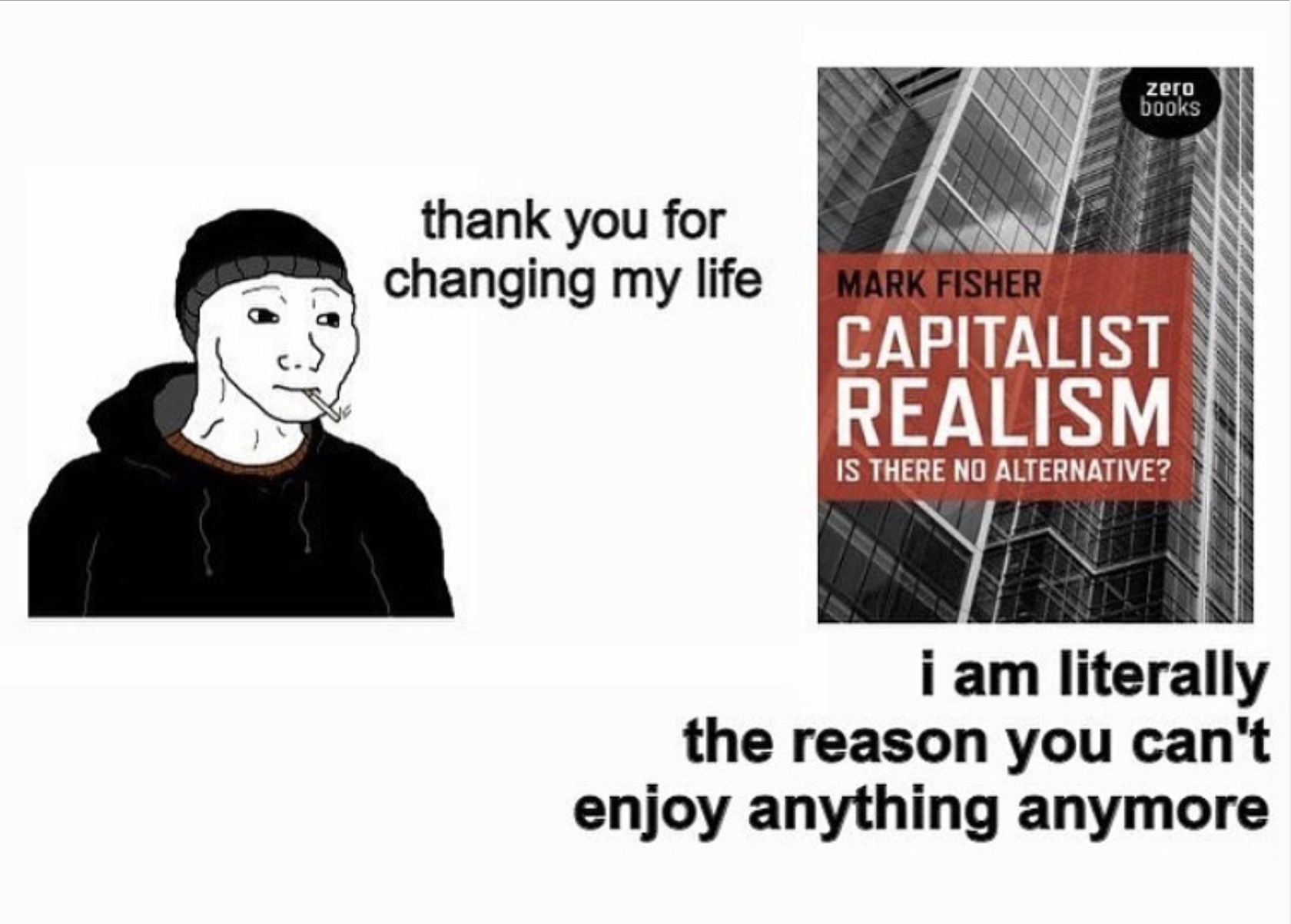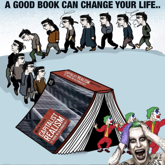 “Capitalism Realism” describes the widespread sense that the only viable political econimic way to organize society is through capitalism. People are literally unable to imagine any other coherent way of organizing society. Capitalism is somethin resembling more a fluid than a monolithic structure, its plasticity is astonishing.